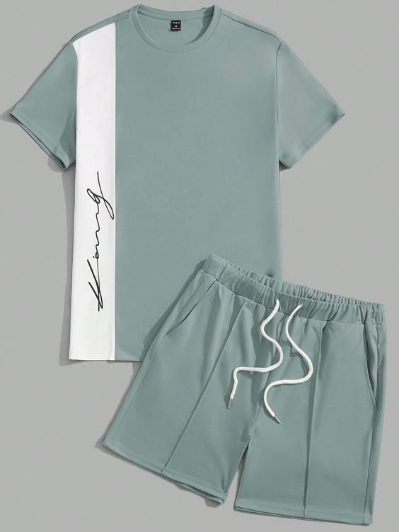 Men Letter Graphic Colourblock Tee & Drawstring Waist Shorts